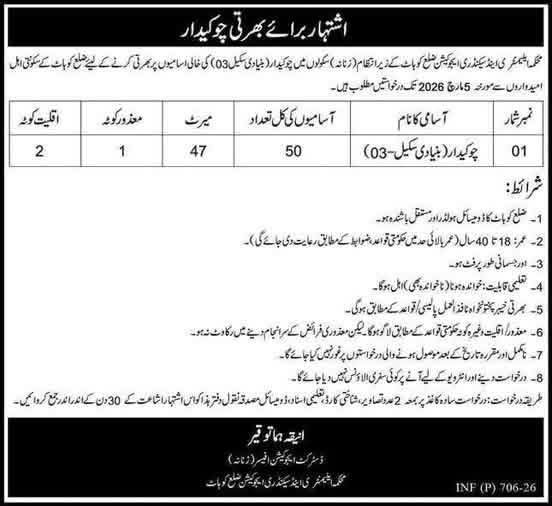 محکمہ ایلیمنٹری اینڈ سیکنڈری ایجوکیشن زنانہ ضلع کوہاٹ میں چوکیدار کی آسامیوں کا اعلان