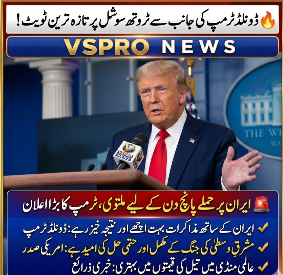 صدر ڈونلڈ ٹرمپ کی جانب سے آج، 23 مارچ 2026، سوشل میڈیا پلیٹ فارم “Truth Social” پر تازہ ترین بیان جاری کیا گیا ہے۔ٹرمپ نے اعلان کیا ہے کہ انہوں نے ایران کے پاور پلانٹس اور توانائی کے بنیادی ڈھانچے پر حملوں کو 5 دن کے لیے ملتوی کر دیا ہے۔ انہوں نے اپنے پیغام میں درج ذیل اہم باتیں کہی ہیں: