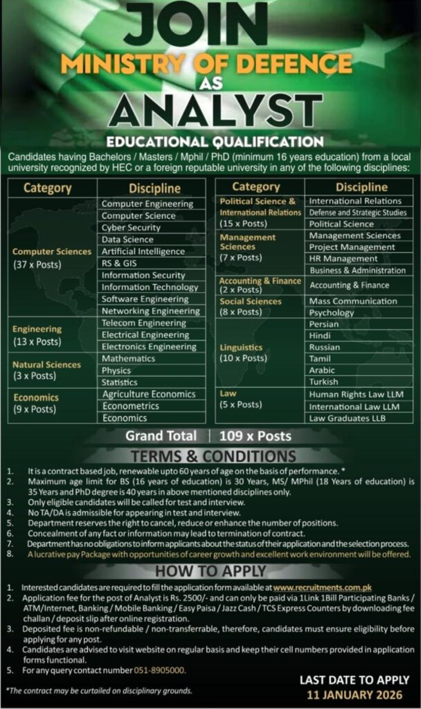 The Ministry of Defence Pakistan has announced exciting career opportunities for talented and motivated individuals to join as Analysts.