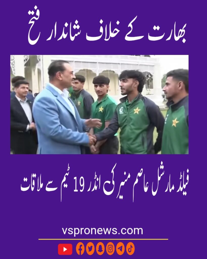 ایشیا کپ میں بھارت کو شکست دینے کے بعد پاکستان انڈر 19 کرکٹ ٹیم نے چیف آف ڈیفنس فورسز فیلڈ مارشل عاصم منیر سے ملاقات کی۔ اس موقع پر فیلڈ مارشل عاصم منیر نے نوجوان کھلاڑیوں کو زبردست کارکردگی پر مبارک باد دی اور کہا کہ ٹیم نے پورے ملک کا سر فخر سے بلند کیا ہے۔