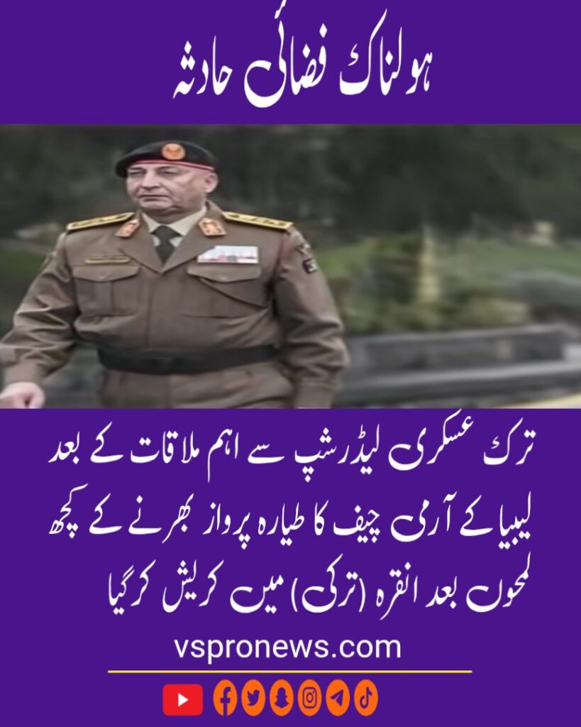 ترکی میں پیش آنے والے ایک افسوسناک فضائی حادثے میں لیبیا فوج کے آرمی چیف جنرل محمد علی احمد الحداد جاں بحق ہو گئے۔ حادثہ اس وقت پیش آیا جب ان کا طیارہ انقرہ سے روانہ ہو رہا تھا۔