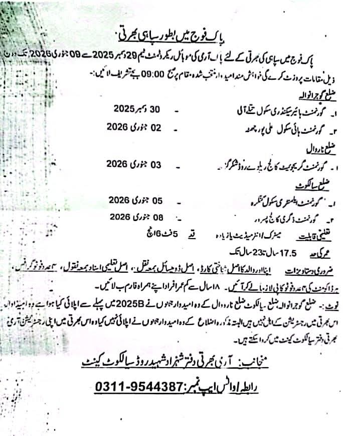پاک آرمی کی موبائل ریکروٹمنٹ ٹیم 29 دسمبر 2025 سے 09 جنوری 2026 تک مختلف مقامات کا دورہ کر رہی ہے۔ خواہشمند امیدوار مقررہ مقام پر صبح 09:00 بجے لازمی پہنچیں۔