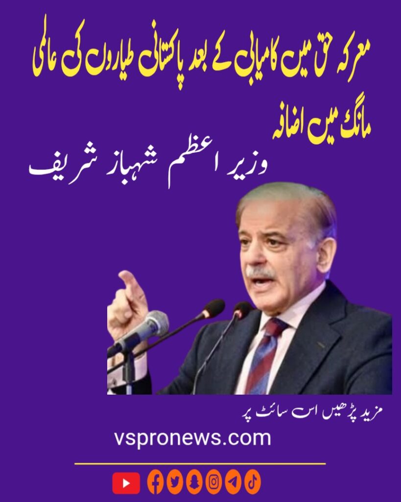 وزیر اعظم شہباز شریف نے کہا کہ معرکہ حق میں کامیابی کے بعد پاکستانی لڑاکا طیاروں کی عالمی سطح پر مانگ میں اضافہ ہوا ہے۔ جے ایف‑17 تھنڈر طیاروں کے لیے کئی ممالک مذاکرات کر رہے ہیں۔
