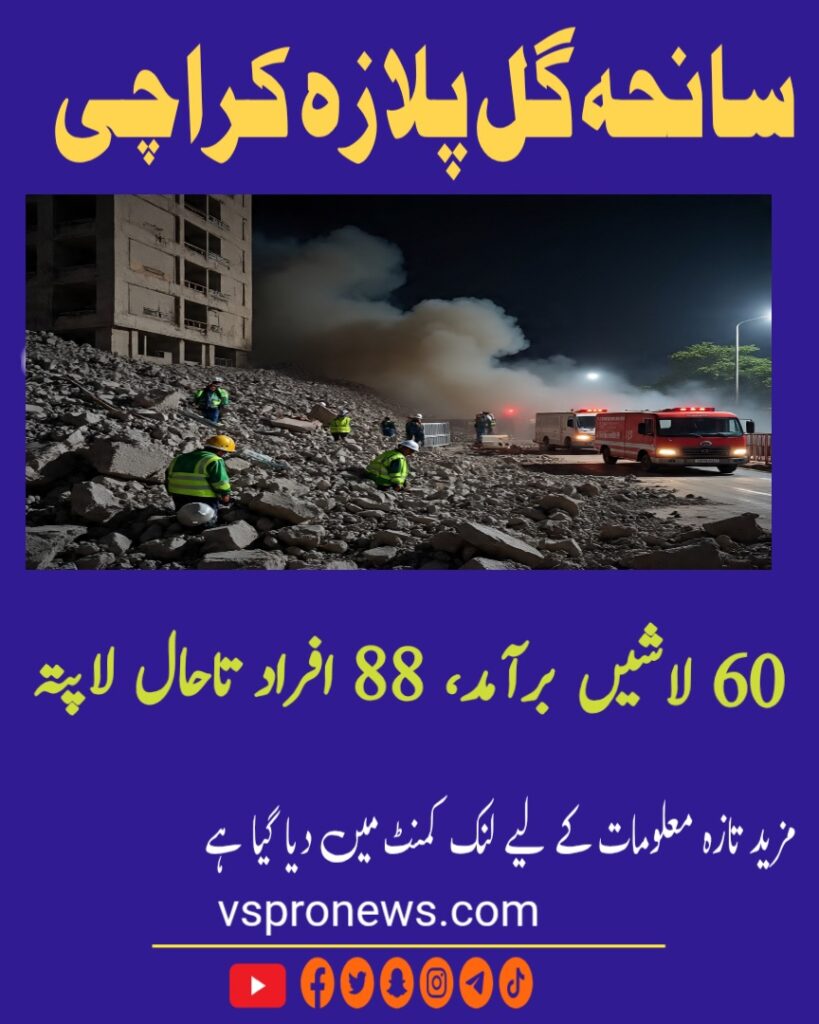 کراچی کے گل پلازہ میں پیش آنے والے المناک حادثے کے بعد ریسکیو کارروائیاں جاری ہیں۔ اب تک ملبے سے 60 افراد کی لاشیں نکال لی گئی ہیں، جبکہ 88 افراد تاحال لاپتہ ہیں۔